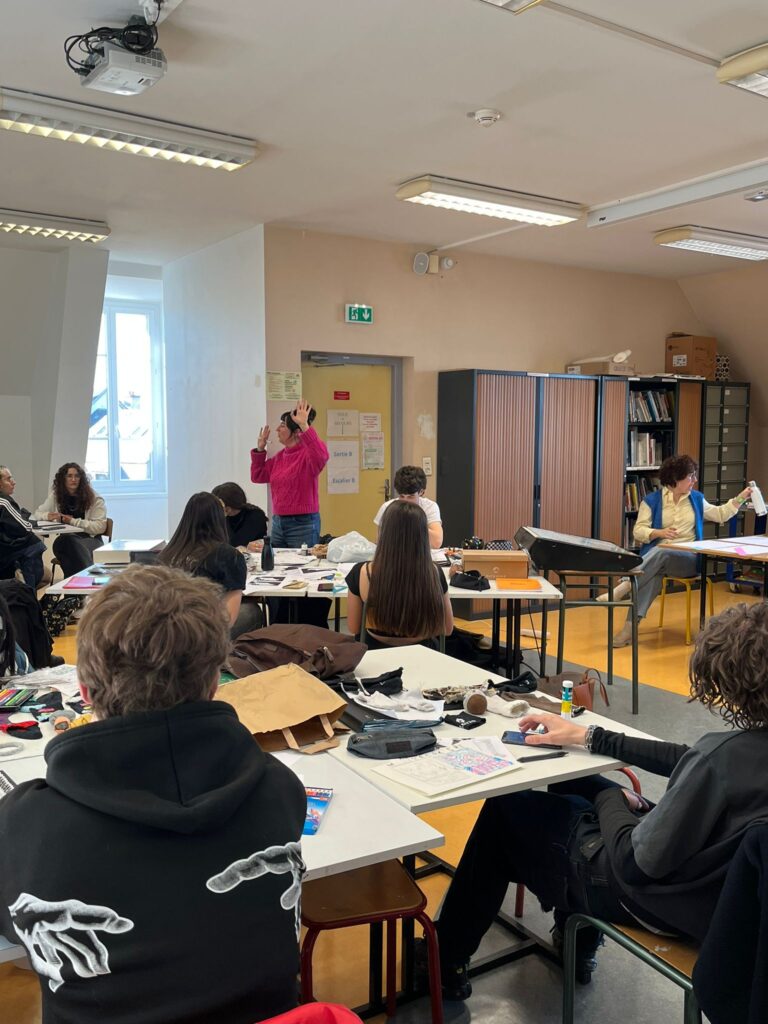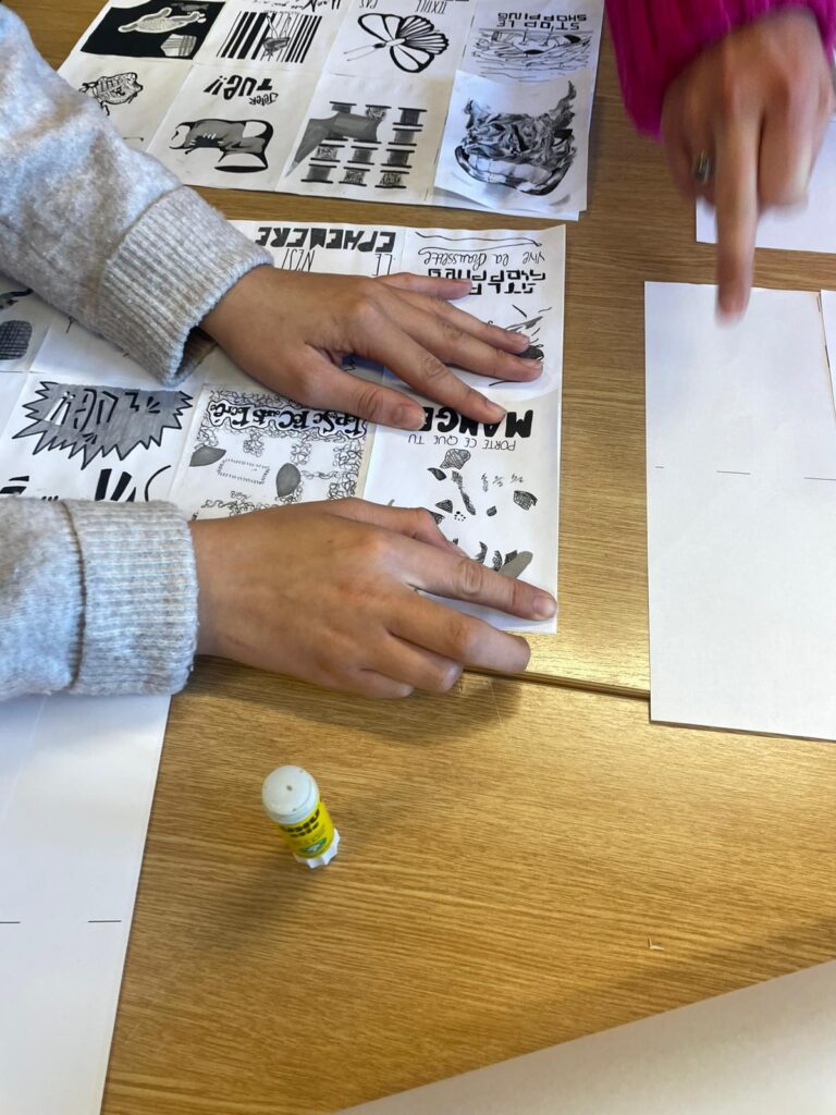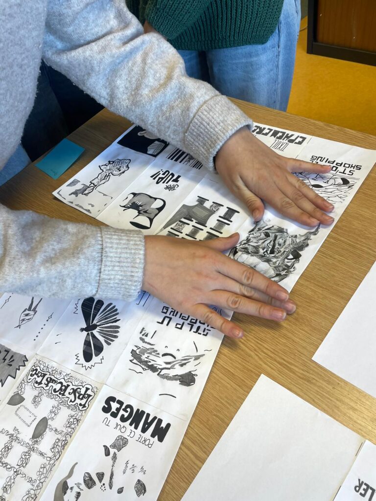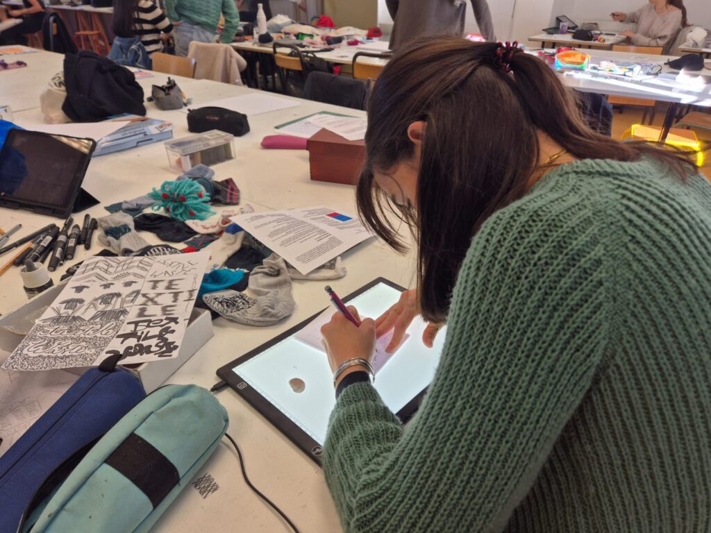 Encadrés par Marianne Rulland, graphiste, qui était intervenue il y a quelques jours pour présenter son travail, les élèves ont élaboré des visuels engagés, format carte postale, sur le thème de la revalorisation textile.
